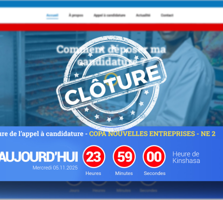 - La date limite de dépôt des manifestations d’intérêt écrites ,en langue française, est fixée au plus tard mercredi 04 avril 2023, et elles doivent être déposées à l’adresse ci-dessous, par courrier physique ou par courrier électronique (e-mail), et porter clairement la mention ci-dessous : AMI n°015/UCP- TRANSFORME/PM/RDC/2023 « CONSTITUTION D’UNE BASE DES DONNEES DES RESSOURCES HUMAINES POUR L’UCP-TRANSFORME ».